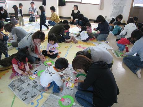 絵の具で緑色に塗った紙皿に、画用紙で作ったサンタさんや飾りを付けて完成(^0^)リボンや雪の結晶、白い毛糸のぼんぼり・・・etc,たくさん付けて賑やかに仕上がってましたよ!