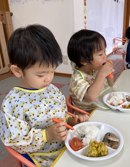 自分のエプロンが置いてある場所に自分で座り「いただきます。」を済ませると、すぐに食べる子と食べさせてもらいたくて待ってる子と様々です。