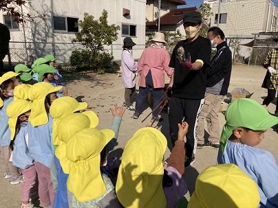 手遊びや保育士のパネルシアターを見た後に、おいも焼けたかな?と先生がおいもを取り出してくれて硬さをチェック!