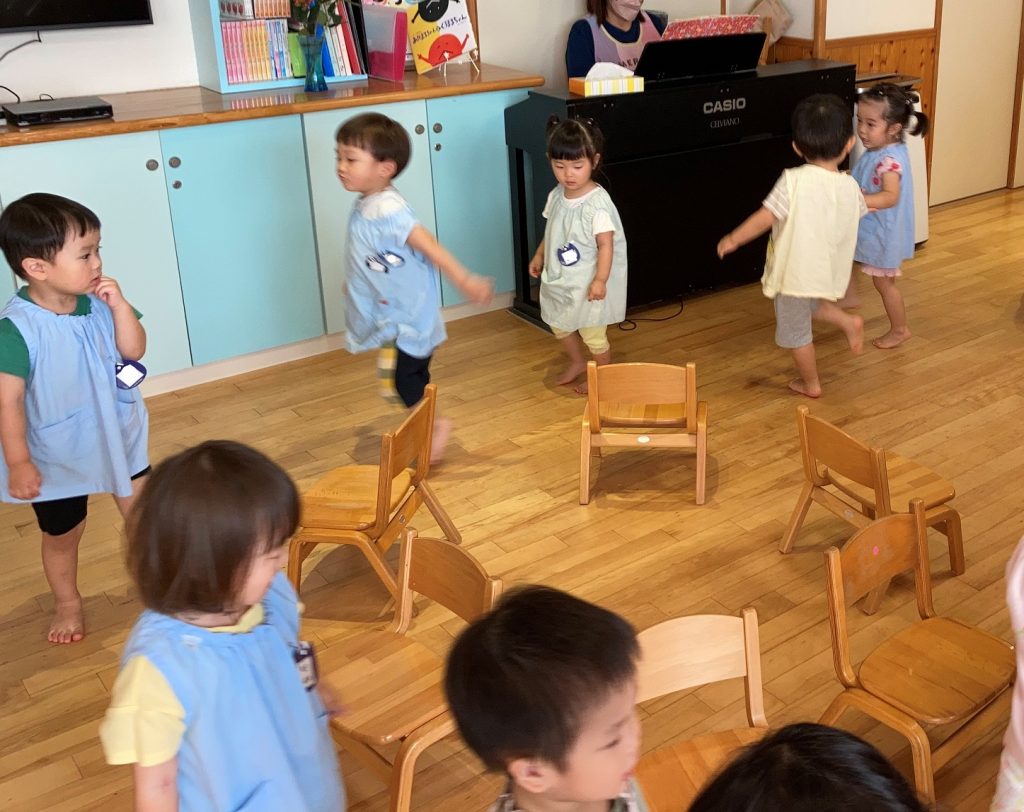 少しずつお約束が守れるようになったたんぽぽ組さん。今日は椅子取りゲームを楽しみました。何度か保育士のピアノの曲が止まると椅子に座ることを楽しみ、ルールが分かるようになると椅子を減らしていきました。