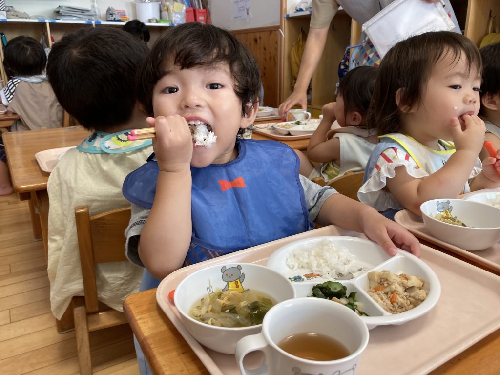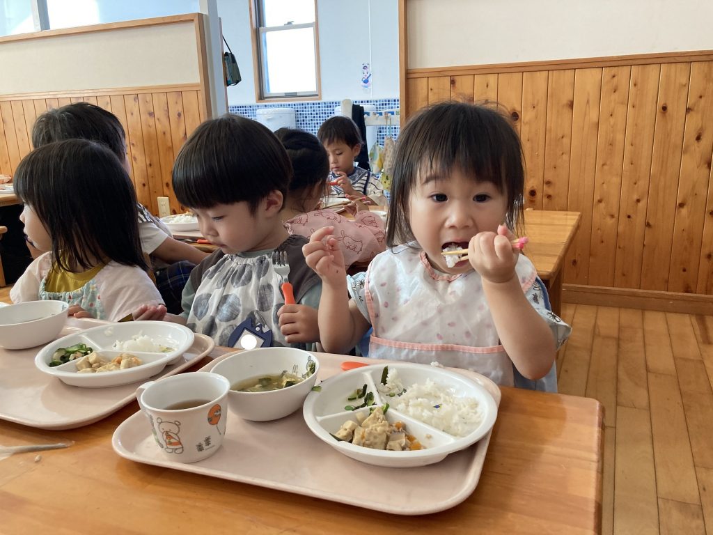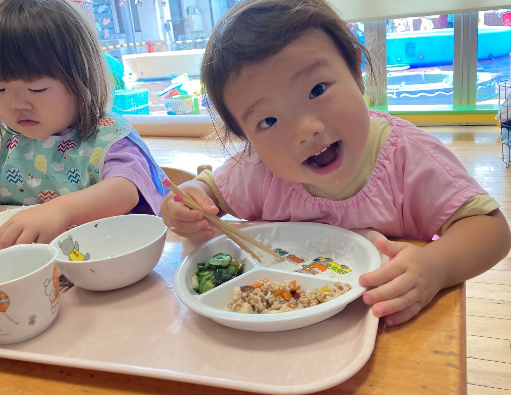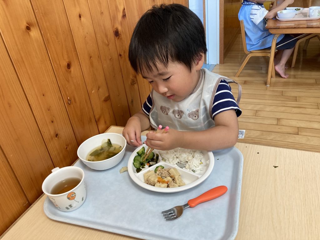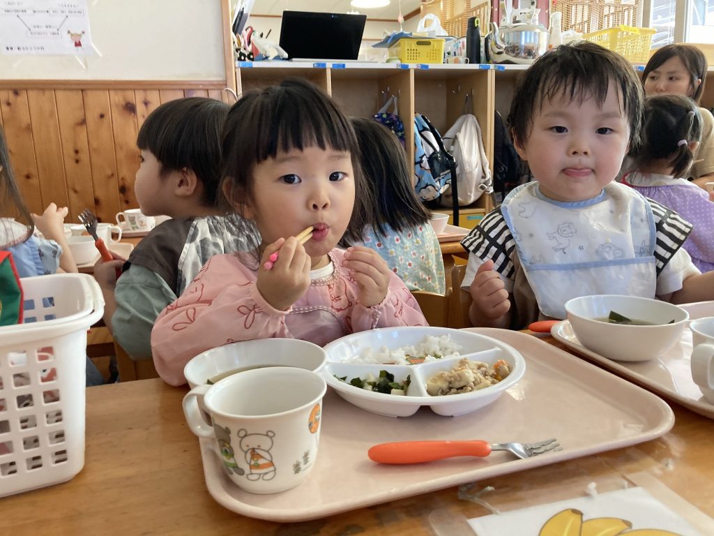 お箸に興味をもち始めた子ども達は、お箸とフォークを用意して使いたい食具で給食を楽しんでいます。