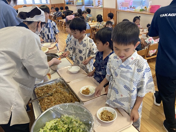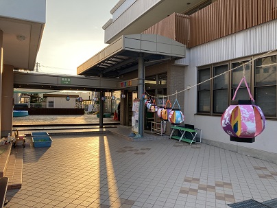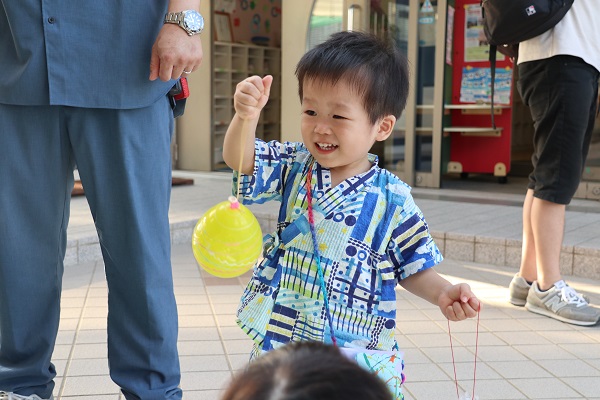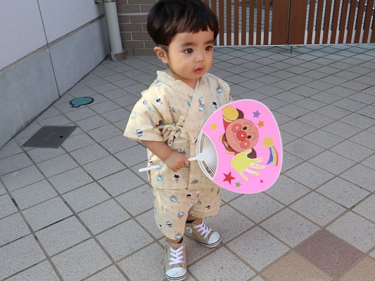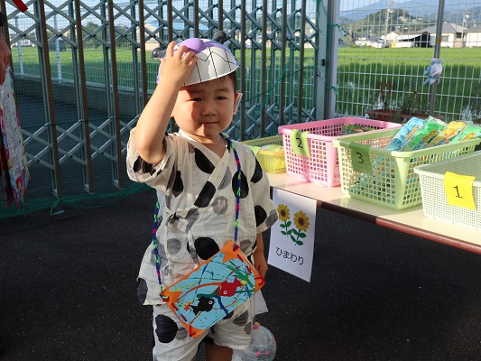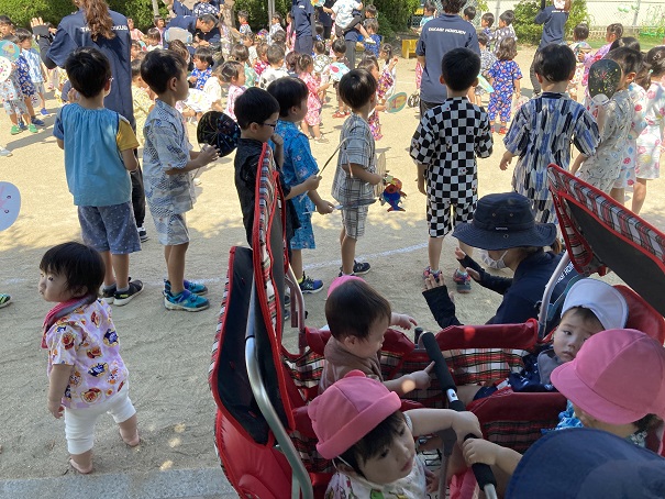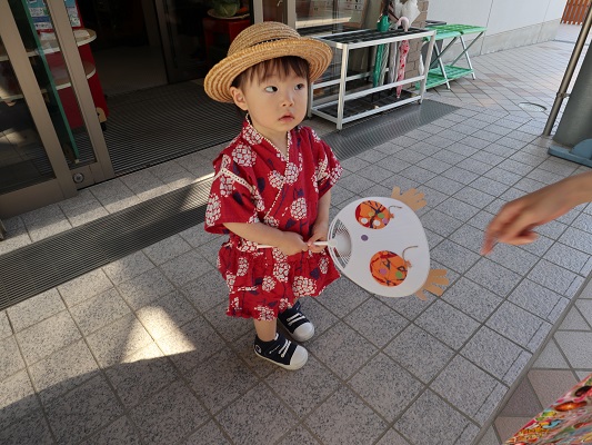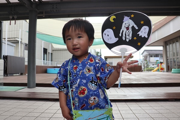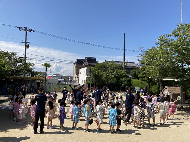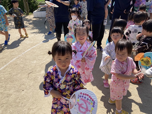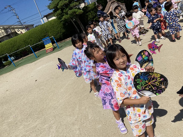 朝は園庭で手作りうちわをもって盆踊りを踊りました。