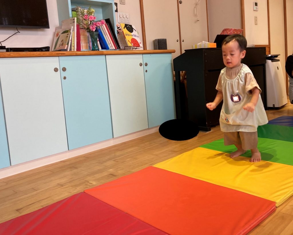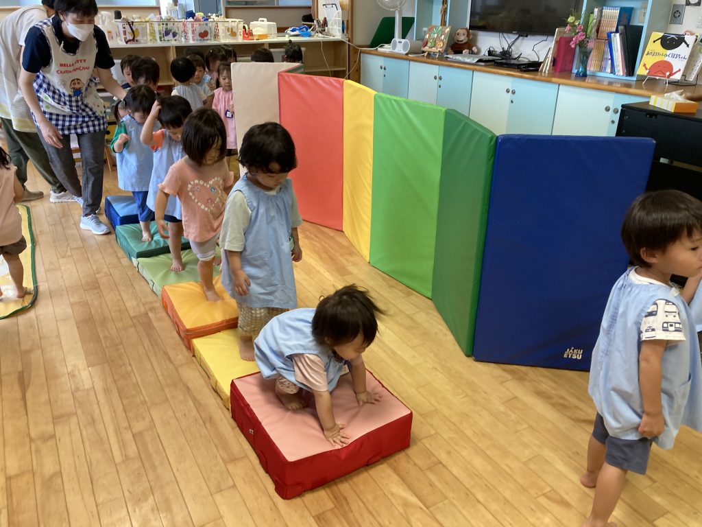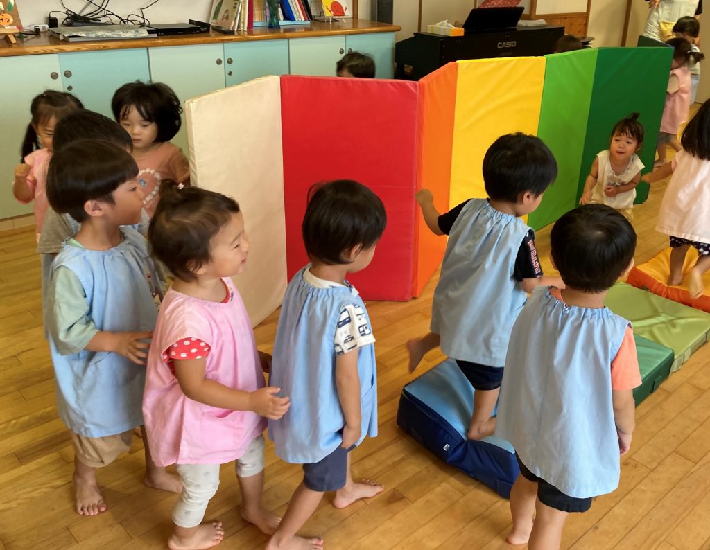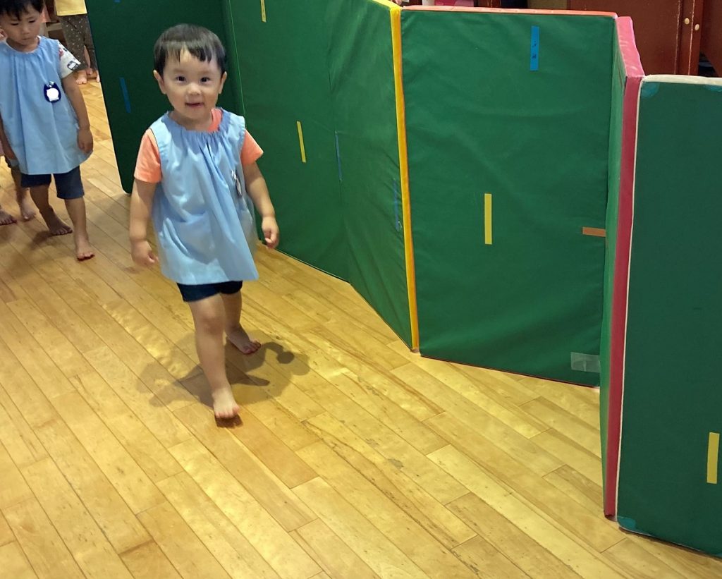 歩きにくいマットの上もバランスを取りながら一生懸命歩いていました。お友達の後ろを歩くお約束も守って楽しく遊びました。