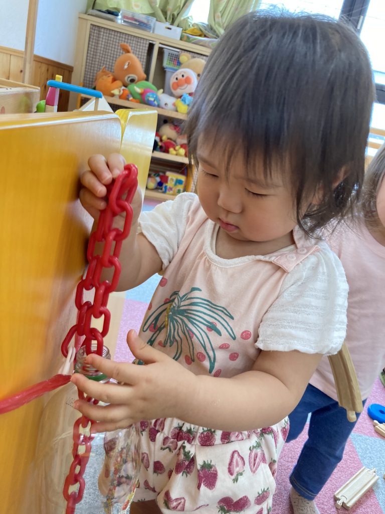 ペットボトルの口から、プラスチックチェーンを入れることに挑戦!