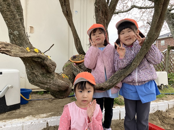 園庭に落ちている花びらを拾い、飾りつけをした後「先生、写真撮って~」とパシャリ📸