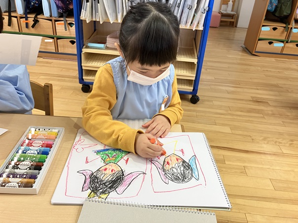 新しいクレヨン、自由画帳で絵を描いたりしていました。