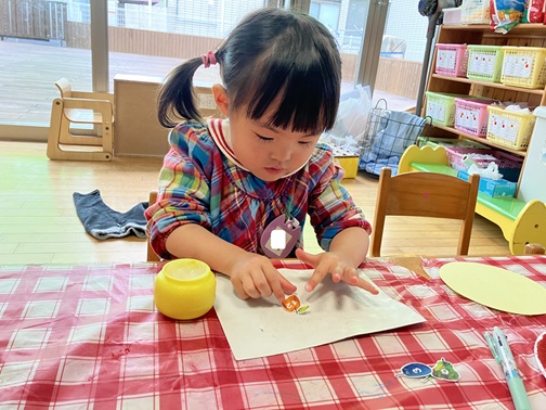 「これでいい?」「ちょっとだけ?」と自分で確認しながら慎重な様子の子。ダイナミックに手にのりをつける子。のりの感触に少し嫌そうな表情の子。様子は様々でしたが、個性豊かな時計が作れました⏰