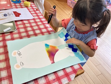 たんぽぽさんが作っていたのは、「しろくまのパンツ」という絵本をテーマとした製作で、洗濯ばさみに干していた物はパンツでした!