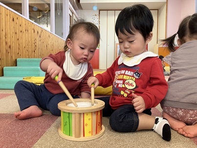 ももぐみの部屋で遊んでいると、よく2階の部屋から楽器の音色が聞こえてきます。そこで、今日は、部屋に太鼓・鈴・タンバリン・鉄琴を用意して楽しみました。子ども達は、気になった楽器を早速手にしていました。