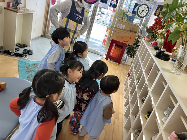 靴箱の上にサンタクロースの人形の足が見えています。人形から流れる音楽♫に合わせて腰に手を当てて楽しそうにダンスタイム。皆で踊ると気分も盛り上がるようです😊