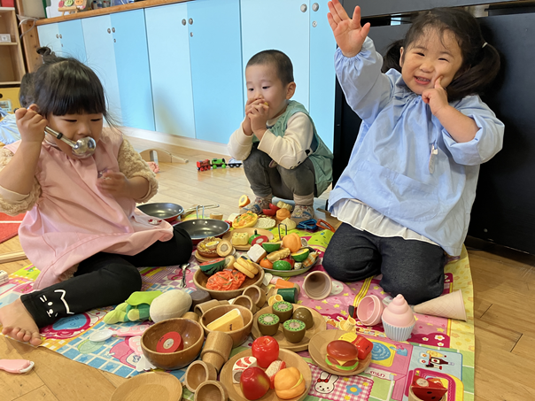 「いっしょにいーれーて」と友達に声を掛けてままごと遊び。友達同士で食べ物を分けあいこをしたり、食べさせてあげたりする様子も見られました。そして、美味しそうなご馳走が並ぶと保育士に「せんせいみて~ごちそうよ~」と嬉しそうに話していました。
