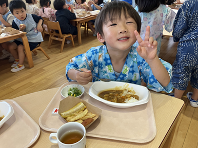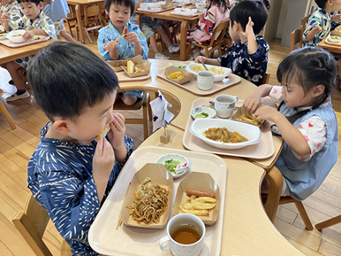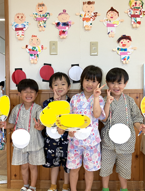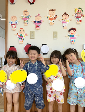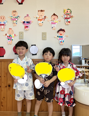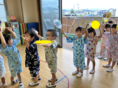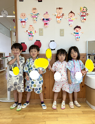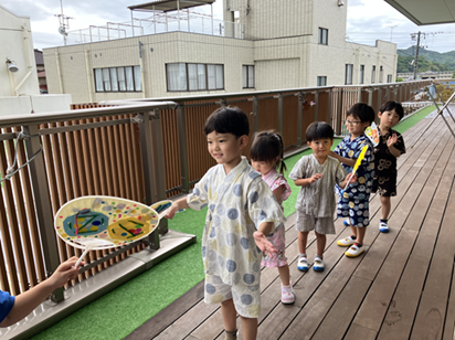 子ども達が楽しみにしていた夏祭りごっこに参加しました。大好きな盆踊りを、友達と元気に踊りました。