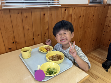給食はメイン料理「カレー」「焼きそば」を選んで、副菜はバイキング形式で好きなものを選んで食べました。