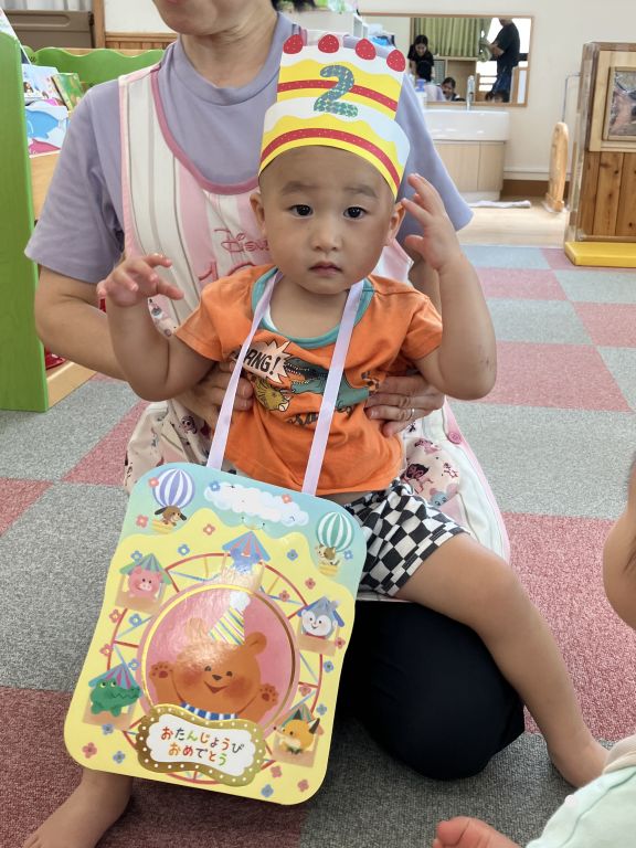 お誕生会では、2歳の冠と誕生カードを身に付けました👑