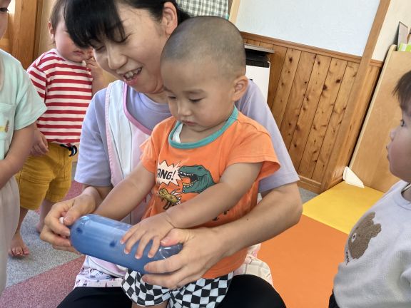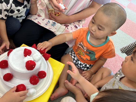 お誕生日のお祝い放送をクラスの皆で聴き、お友達や保育士に囲まれて、たくさん「おめでとう」とお祝いをしてもらっていました🎵