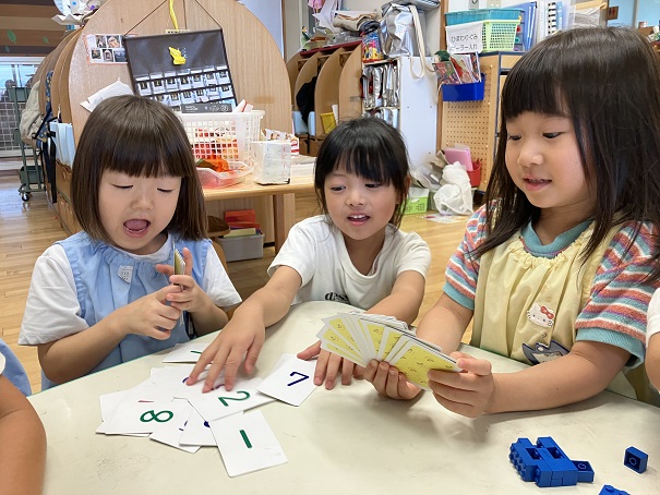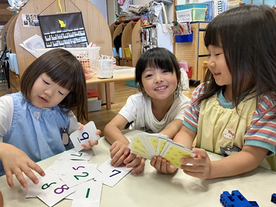 ゆう先生からカードゲームのルールを教えてもらった年長児。
