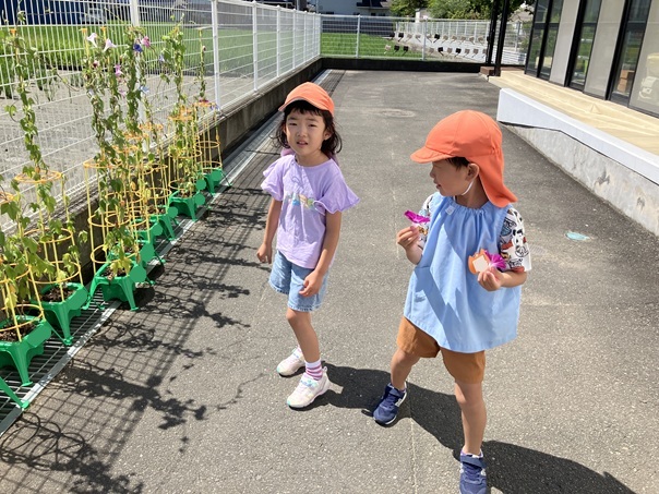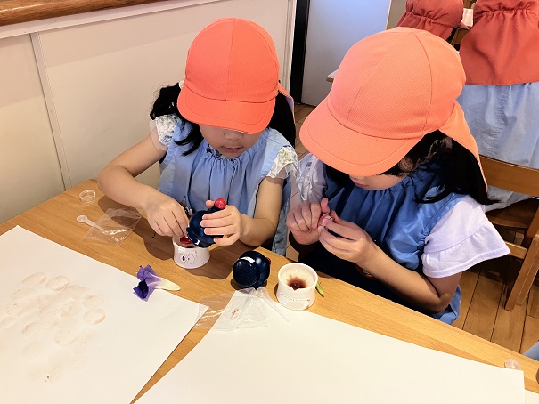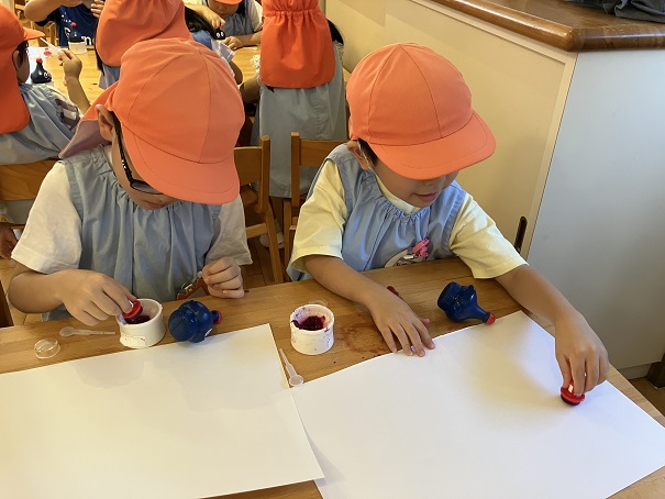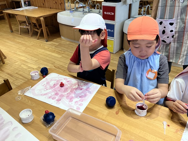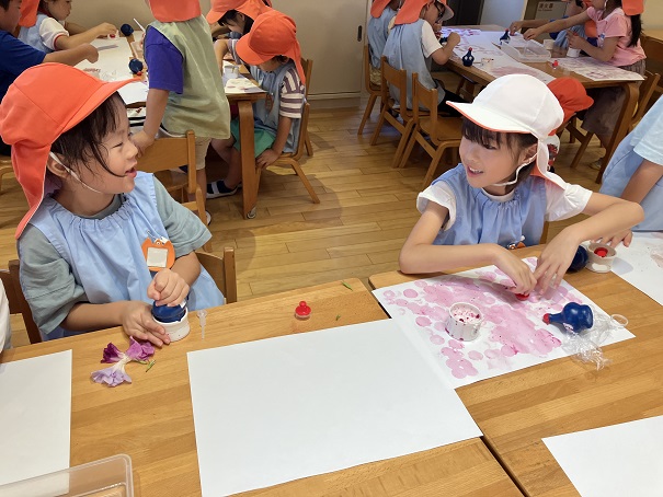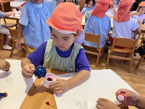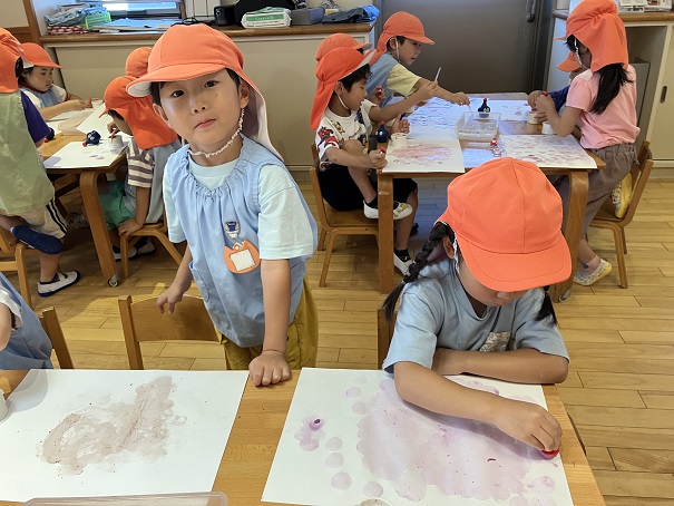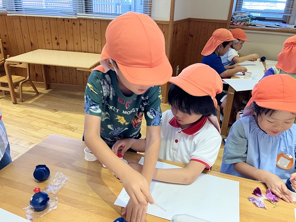 チケット入れ制作であさがおの色水スタンプをして以来、「もう1回したい」と楽しみにしていた子どもたち。