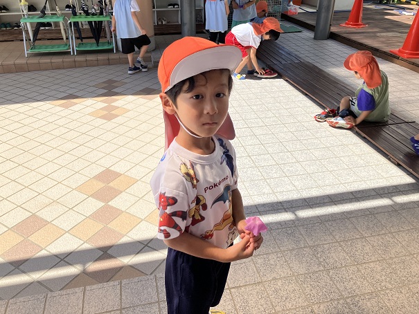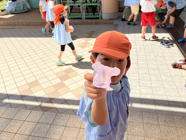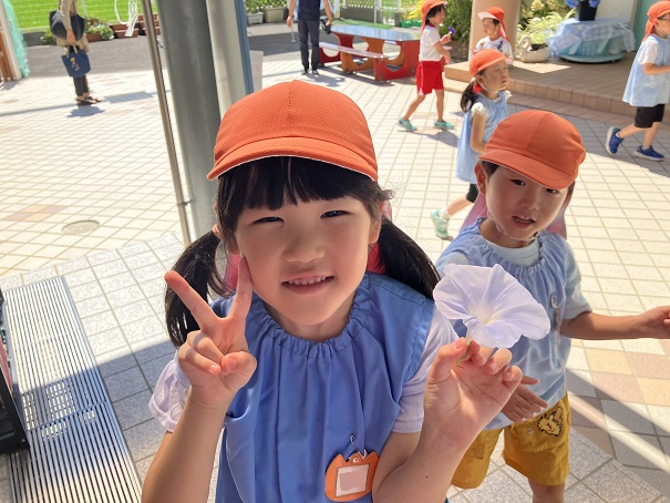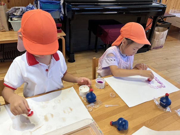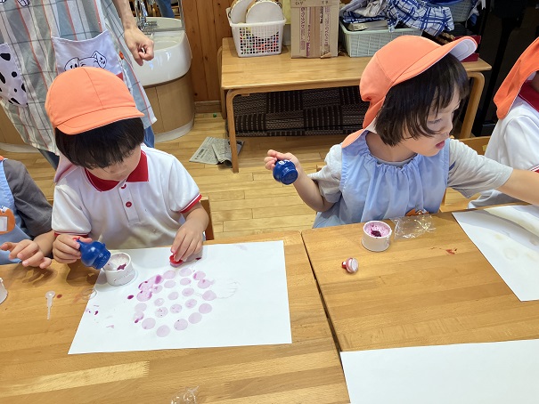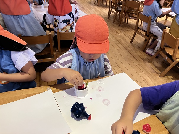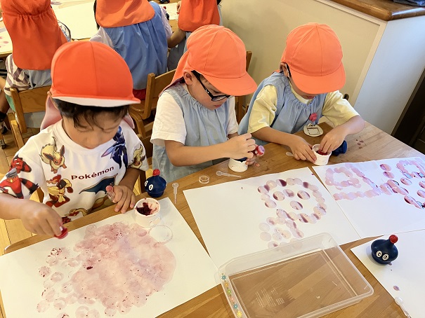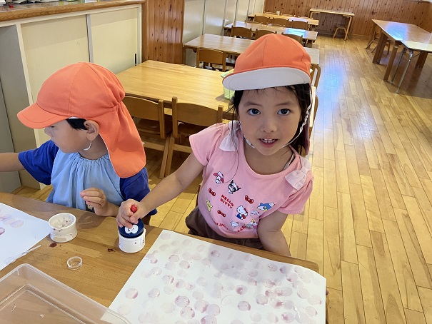 自分で作ったあさがおスタンプ。保育士が作った時とは比べ物にならないくらい生き生きとした表情でスタンプを押していました☺