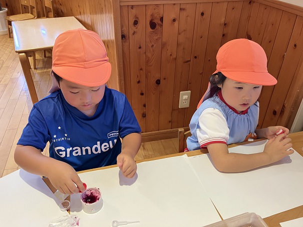 「すりつぶす」ことも「スポイトで水を吸う」ことも初めての子どもたちには難しいです。これも経験です。