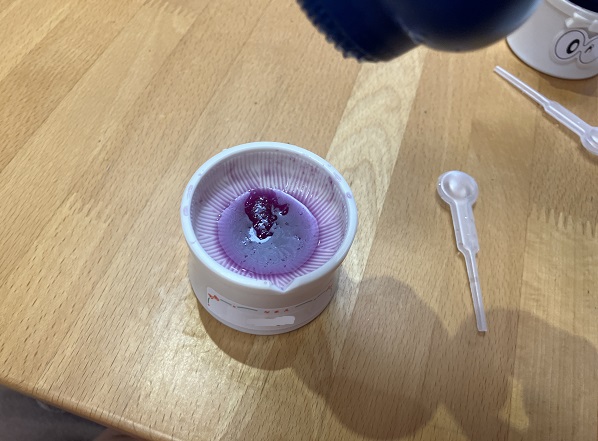 部屋に戻って、すり鉢に入れたあさがおをすりつぶして、スポイトで水を入れていきます。