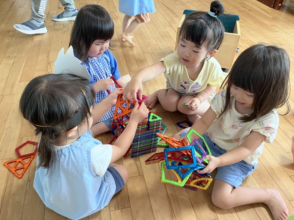 お友達と遊ぶことが大好きなAちゃん。仲のよいお友達と一緒に、ままごとや、マグフォーマーで遊びながらお喋りを楽しんでいます。