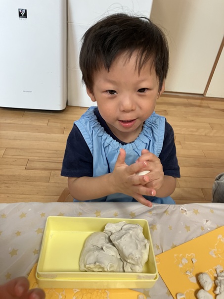 粘土遊びが好きになってきたOくん。こねこねと捏ねながら粘土の柔らかい感触を楽しみ、こねた粘土を嬉しそうに保育士に見せてくれます😊