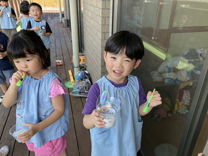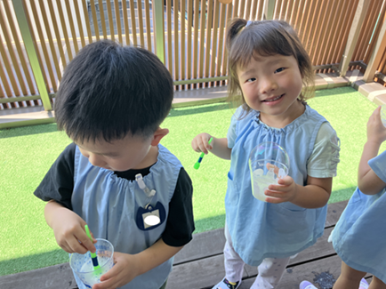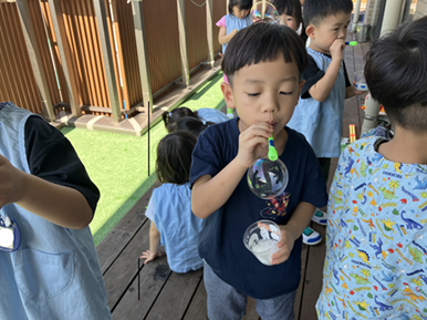 自分で作ったしゃぼん玉液でしゃぼん玉ができると満面の笑みで嬉しそうな子ども達。
