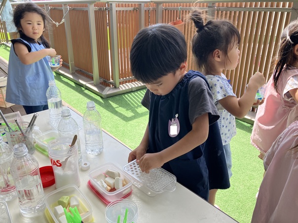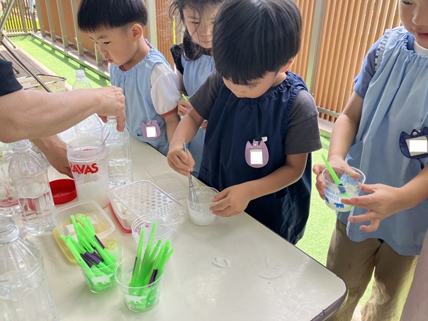 先日、シャボン玉遊びを楽しんだちゅうりっぷ組さん。今日は、自分でシャボン玉液を作ってみました。