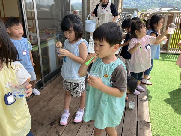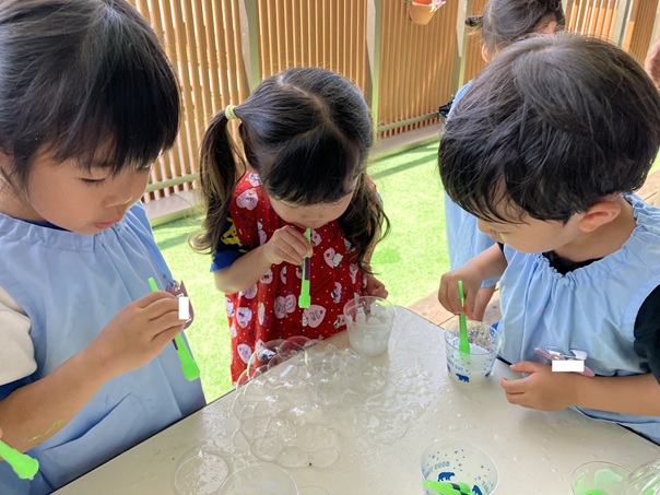 友達と一緒に机の上のシャボン玉に息を吹きかけます。ブクブク泡がだんだん大きくなって大喜びでした。