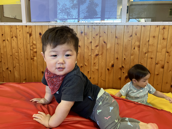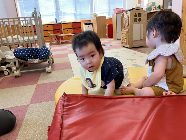 いつも保育室に置いてあるマットを、今日はスロープと組み合わせて少し高さを出し、ハイハイで山登りができるようにしてみました🏔️