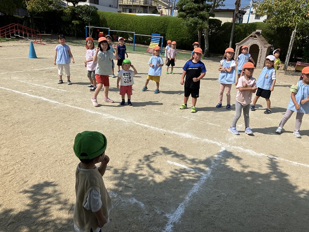 園庭で運動会に向けて活動していると、1歳児の子どもたちが園庭に遊びに来ていました。