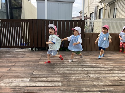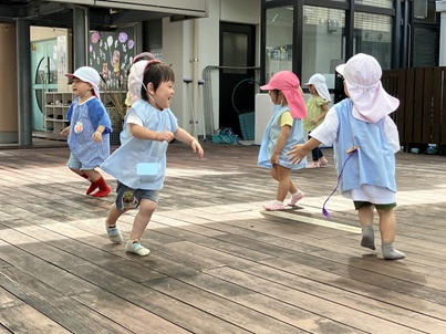 始めは、保育士がつけているしっぽを狙って追いかけていましたが、『おさない・(服を)ひっぱらない』という、約束を守って楽しんでいたので、子ども達にも順番にしっぽをつけることに。