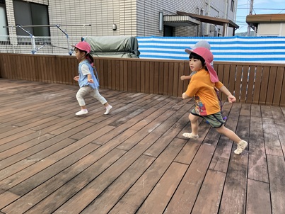 広いウットデッキをたくさん走り回って楽しんでいました。
