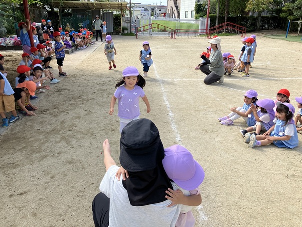 少しずつ暑さも和らぎ、園庭で遊ぶ機会が多くなりました。今週は朝の外遊びの〆にみんなでかけっこをしました。園庭にできたトラックの線の外側を走るようにルールの説明もしました。