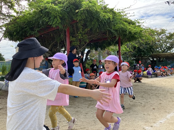 保育士の「よーい、スタート!」の合図で、友達と一緒にかけっこ。今日は、大好きな保育士がゴールで待ってくれていました。元気よく走り、満面の笑顔でゴールすることが出来ました。