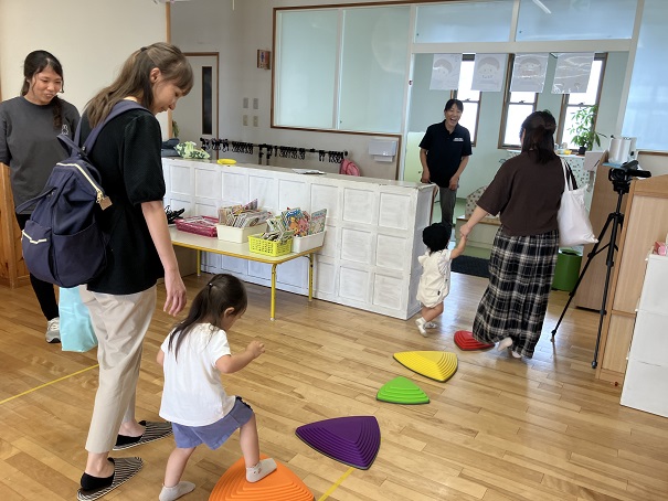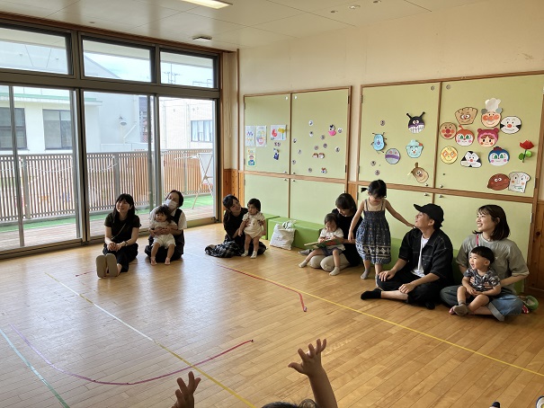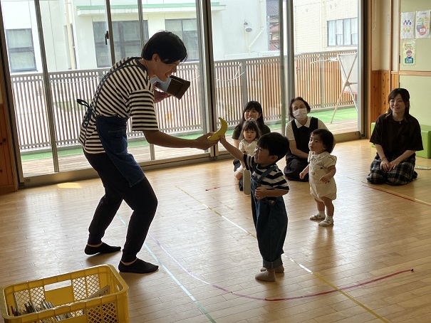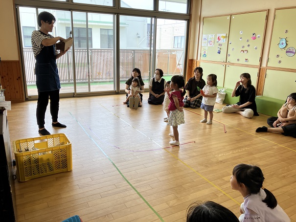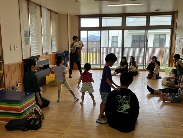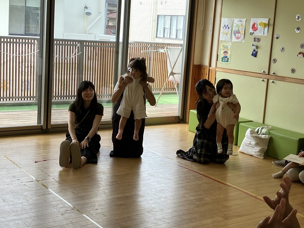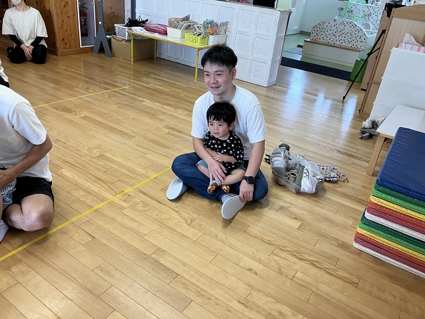 はじめは緊張して、お父さんお母さんにピタッとくっついていた子どもたちも徐々にリラックスしてゆうせんせーと打ち解けていきました☺