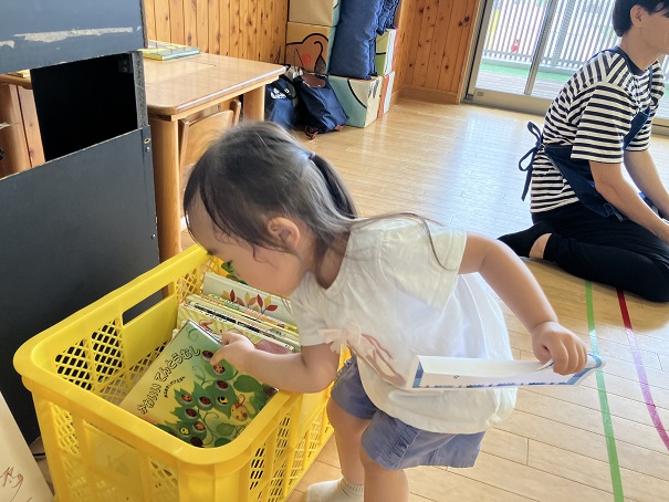 「なにをたべてきたの?」の絵本を読んでもらいながら、食べたものの色を探して運びます。
