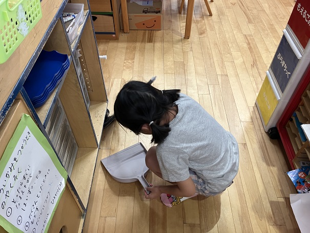 ちりとりとほうきを渡すと自分で集めていました。