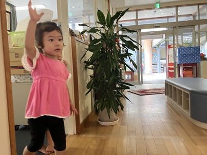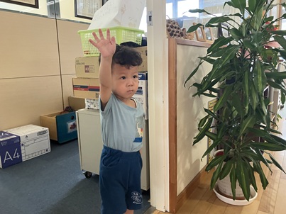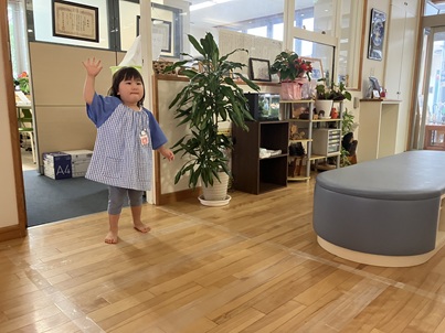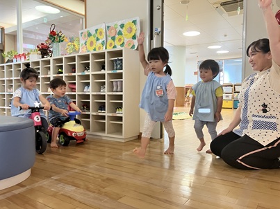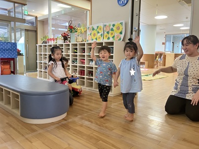 車役も子ども達が交代でしてくれ、本物の道路を歩いている気分でした。晴れた日には、お散歩に出かけ、涼しさを感じながら、秋探しを行ったり、道路の安全な歩き方を覚えたりしていきたいと思っています。