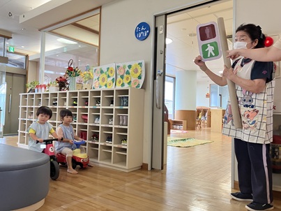 信号機のイラストを見て『あか とまる』『あお すすむ』と信号の意味を知っている子が数名いて保育士は、ビックリ😯!“信号が青になってもすぐに渡ったら危ないよ。車が来てないか確認して手をあげて渡るよ。”と保育士に教えてもらい、いざ実践🚩