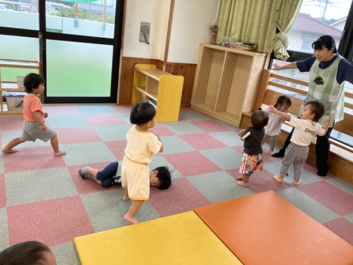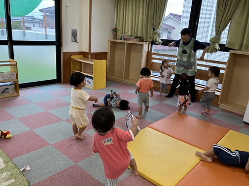 今日は雨が降っていたので外には行けず、、、お部屋の中にマットやトンネル、メロディマットを出して運動遊びをしました。いっぱい遊んで楽しんだ後、マットやトンネルを片付けるととても広い部屋。みんなで何しようかな~と考え、、、。