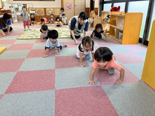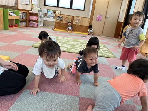 もうハイハイをすることもほとんどなくなったと思います。久しぶりにみんなでハイハイをすると大盛り上がり✨笑顔いっぱいゴールまで進んでいました。
