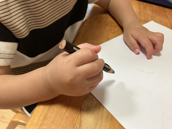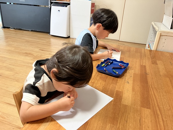 土曜日、年長児がお絵描きをしていると、1歳児の子が「したい!」と隣に並んでお絵描きを始めました。