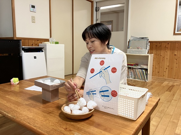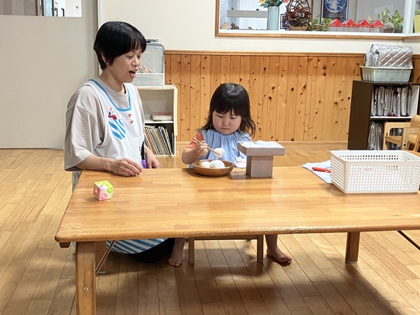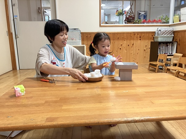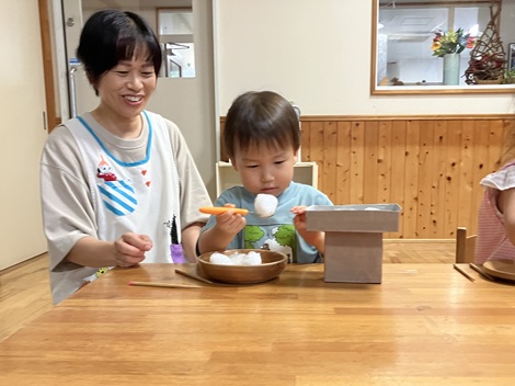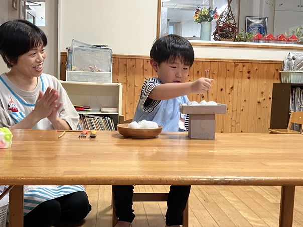 保育士が綿で作ったお月見団子を、フォークや箸の持ち方を知らせながら、すくったり挟んだりして見せました。子ども達も「したい!」と興味をもってくれました😉みんな真剣な表情でフォークや箸を正しく持とうとしていました。すくったり、挟んだりすることができると、嬉しそうに三宝に運んでいました。