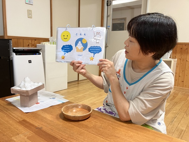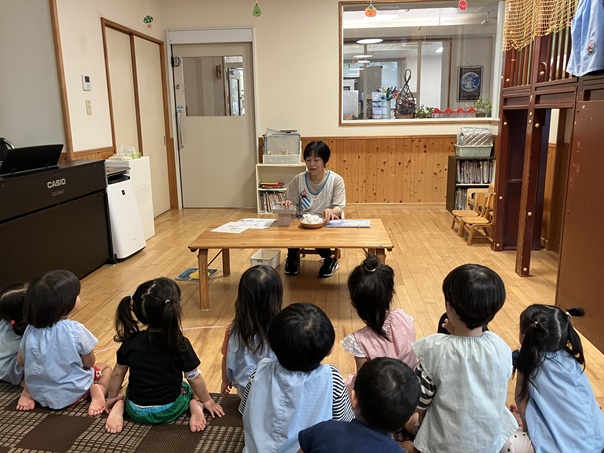 そこで、今月の食育活動は、お月見についてお話をしました。なぜお月見には、「ススキやお月見団子をお供えする」のか、「まん丸のお月さまの中には昔からうさぎが住んでいる」と言われていることなどをお話をしました。