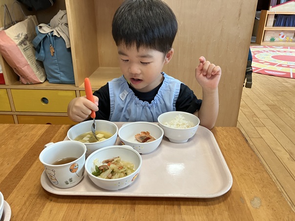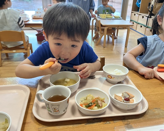その日の給食では、正しい持ち方を意識しながら食べている子が多く、「せんせい、みて」と、保育士に食べている様子を見せてくれました。