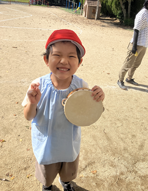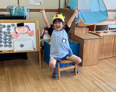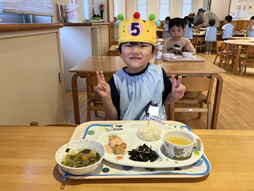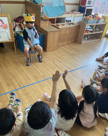 H君のお誕生会を行いました。園庭で放送が流れると、友達に「おめでとう。」とお祝いして貰い「ありがとう。」と嬉しそうでした。