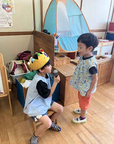 インタビュータイムでは、「好きなおもちゃ」や「好きなケーキ」などの質問に一つ一つの真剣に考えて答えていました。