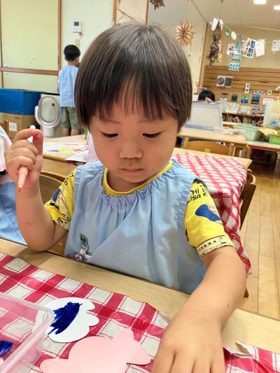 おばけをイメージしながら色を重ねたり、顔を描いたりしているお友達が