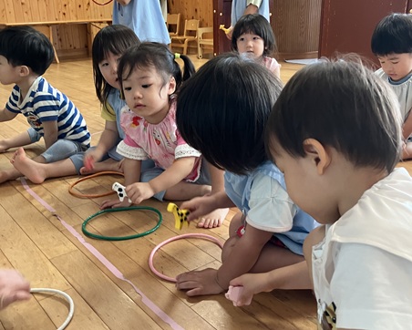 次は、「のねずみ」の曲をかけました。歌の中に「チュウチュウ🐭」とねずみの鳴き声があります。その鳴き声の時だけ、輪っかの中に持っている動物の積み木を入れてあげます。